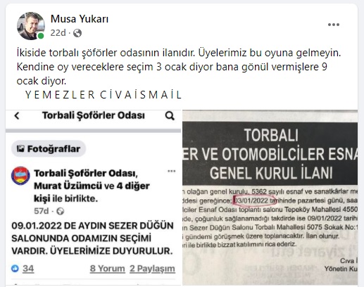 Musa Yukarı açıklamasında, “Torbalı Şoförler Odası seçimi 03.01.2022 Pazartesi günü, odadaki toplantı salonundadır. Ancak yeterli çoğunluk sağlanamazsa 09.01.2022’de Aydın Sezer Düğün Salonu’nda yapılacaktır. Üyelerimizin bu kelime oyununa gelmemeleri önemle rica olunur. Farklı yerlerde farklı tarih vererek bu insanları artık aldatamayacaksınız. 16 yılın sonu göründü. Yalanla dolanla yada oy böldürerek veya ırkçılık yaptırarak kazandığınız seçimli yıllar sizlerde kalsın. Esnaf yemez artık bu numaraları. Üyeler herşeyin farkında” ifadelerini kullandı.